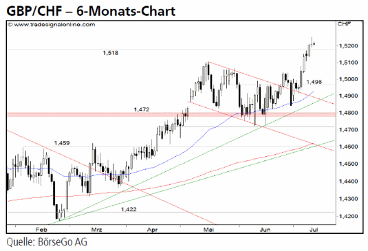 Ausblick: Der Aufwärtstrend bei GBP/CHF hat durch den jüngsten Ausbruch neue Dynamik erhalten. Das kurzfristige Ziel bei 1,530 CHF ist in greifbarer Nähe. Die Long-Szenarien: Kann das Hoch bei 1,525 CHF überwunden werden, dürfte sich die Hausse direkt bis 1,530 CHF fortsetzen. Sollte im Anschluss auch diese starke Barriere durchbrochen werden, sind Folgekäufe bis 1,555 CHF zu erwarten. Die Short-Szenarien: Zu einer leichten Zwischenkorrektur kann es dagegen bei einem Rücksetzer unter 1,511 CHF kommen. Diese Gegenbewegung dürfte das Währungspaar bis zur Unterstützung bei 1,504 CHF und darunter gegebenenfalls bis 1,496 CHF korrigieren lassen. Auf diesem Niveau wäre jedoch mit einer Fortsetzung der Aufwärtstendenz und einem weiteren Anstieg bis 1,523 CHF zu rechnen. Sollte diese Unterstützung dagegen gebrochen werden, wäre der Ausbruch missglückt und Abgaben bis 1,480 CHF zu erwarten.