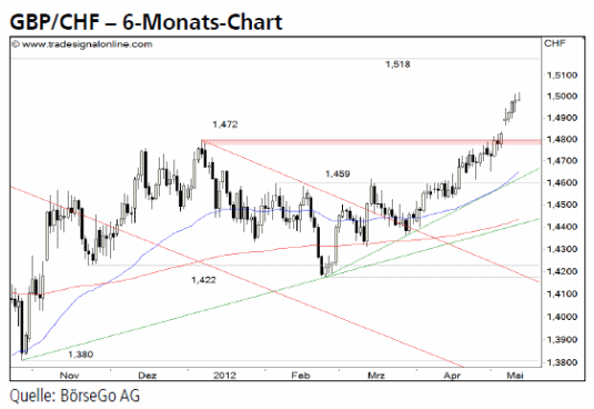 Ausblick: Die Auswirkungen des Ausbruchs über 1,472 CHF dürften sich nun insbesondere in einem langfristigen Anstieg des Devisenpaars bemerkbar machen. Kurzfristige zwischenzeitliche Rücksetzer sollten hierbei jedoch einkalkuliert werden. Die Long-Szenarien: Verbleibt GBP/CHF oberhalb der Zwischenunterstützung bei 1,486 CHF, wäre der Widerstand bei 1,518 CHF direkt erreichbar. Doch selbst ein vorheriger Rücklauf an die 1,472 CHF-Marke würde an diesem Szenario zunächst nichts ändern. Kann der Wert sogar über 1,518 CHF ausbrechen, wäre eine weitere Kaufwelle bis 1,530 und 1,555 CHF möglich. Die Short-Szenarien: Erst ein deutlicher Rückfall unter 1,472 CHF würde für eine ausgedehntere Korrektur bis 1,459 CHF sprechen. Im Falle einer Verteidigung dieser Unterstützung bestehen nach unserer Einschätzung wiederum gute Chancen auf eine Erholung und einen weiteren mittelfristigen Anstieg. Wird die Unterstützung dagegen unterschritten, wäre der Aufwärtstrend seit Ende Februar in Frage zu stellen. In diesem Fall wäre ein Ausverkauf bis zur wichtigen Haltemarke bei 1,422 CHF wahrscheinlich.
