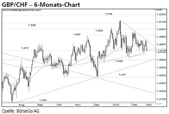 Ausblick: Die Chancen die Konsolidierungsphase seit Januar in Kürze zu beenden, sind für die Käuferseite erheblich gestiegen. Die Chartformation und der jüngste Anstieg unterstreichen dies. Die Long-Szenarien: Kann das Währungspaar jetzt über die Abwärtstrendlinie und anschliessend auch direkt über den Widerstand bei 1,492 CHF ausbrechen, wäre die Korrektur beendet. In der Folge sollte ein Kaufimpuls einsetzen, der GBP/CHF bis an die 1,500 CHF-Marke und darüber bis an die zentrale Kurshürde bei 1,508 CHF antreiben dürfte. An dieser Stelle könnte es zu einer weiteren heftigen Auseinandersetzung der Marktteilnehmer kommen. Wird die Barriere im weiteren Verlauf jedoch durchbrochen, würde dies ein mittelfristiges Kaufsignal und eine Kaufwelle bis 1,555 CHF nach sich ziehen. Die Short-Szenarien: Oberhalb von 1,472 CHF dominieren aktuell weiterhin die Bullen. Erst ein Ausverkauf unter die Haltemarke würde den Wert wieder unter Druck setzen. In diesem Fall könnte es jedoch bereits auf Höhe der Unterstützung bei 1,459 CHF zu einer weiteren Erholung kommen. Dagegen hätte ein Bruch der Marke ein Verkaufssignal und Abgaben bis 1,437 CHF zur Folge.