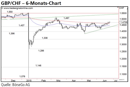 Ausblick: Der Anstieg in dieser Woche hat eine wichtige Hürde auf dem Weg in Richtung des Hochs aus dem März aus dem Weg geräumt. Damit haben die Bullen bei GBP/CHF wieder das Ruder übernommen. Die Long-Szenarien: Kurzfristig dürfte das Devisenpaar jetzt an die markante Barriere bei 1,497 CHF haussieren. Darüber wäre bereits eine Ausweitung des Anstiegs bis an das Hoch der Erholung bei 1,519 CHF zu erwarten, ehe an dieser Stelle eine Gegenbewegung einsetzen kann. Denn kampflos dürften die Bären den Käufern das Feld nicht überlassen. Nach einer solchen Abwärtsbewegung hätte das Paar jedoch die Chance, mit einem Ausbruch über den Widerstand ein weiteres Kaufsignal zu generieren und auf Sicht einiger Wochen bis 1,550 CHF zu klettern. Die Short-Szenarien: Sollte der Wert jetzt wieder unter die 1,471 CHF-Marke zurücksetzen wäre der Ausbruch damit noch nicht gestoppt. Bereits bei 1,455 CHF stünden die Chancen für die Bullen günstig, den Aufwärtstrend der letzten Wochen dynamisch fortzusetzen. Abgaben unter diese kleine Unterstützung würden jedoch für einen deutlicheren Rücksetzer bis 1,437 CHF sorgen. An dieser Kreuzunterstützung entscheidet sich der weitere Kursverlauf: Scheitert dort eine Stabilisierung, würde ein Bruch der Marke zu einem Ausverkauf bis 1,396 CHF führen.