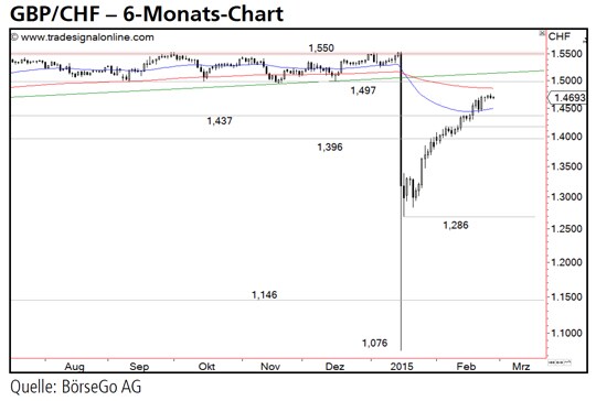 Ausblick: Nach dem starken Konter der Bullen ist GBP/CHF im Bereich kurzfristiger Widerstände angelangt. Sollten diese ebenfalls durchbrochen werden, könnte sich die Erholung weiter ausdehnen. Die Long-Szenarien: Steigt GBP/CHF in den kommenden Tagen über die Hürde bei 1,476 CHF an, könnte die Widerstandszone von 1,494 bis 1,497 CHF angesteuert werden. An dieser Stelle wäre mit Gegenwehr seitens der Bären zu rechnen. Sollte es den Bullen gelingen, die 1,497 CHFMarke nach einer kurzen Korrekturphase zu durchbrechen, käme es bereits zu einem Anstieg an die im Januar unterschrittene ehemalige Aufwärtstrendlinie. Diese verläuft aktuell auf Höhe von 1,515 CHF und könnte zum Ausgangspunkt für eine weitere Korrekturbewegung werden. Kann dieser Preisbereich ebenfalls durchbrochen werden, wäre sogar ein mittelfristiger Aufwärtsimpuls bis 1,550 CHF denkbar. Die Short-Szenarien: Sollte das Währungspaar dagegen auf dem aktuellen Niveau nach unten drehen, könnte ein weiterer Anstieg von der Unterstützung bei 1,437 CHF ausgehen. Wird die Haltemarke dagegen nicht zu einer Stabilisierung genutzt, dürfte ein Ausverkauf bis 1,418 CHF belasten. Darunter würde die wichtige Unterstützung bei 1,396 CHF angesteuert und damit die Erholung der letzten Wochen wieder in Gefahr geraten.
