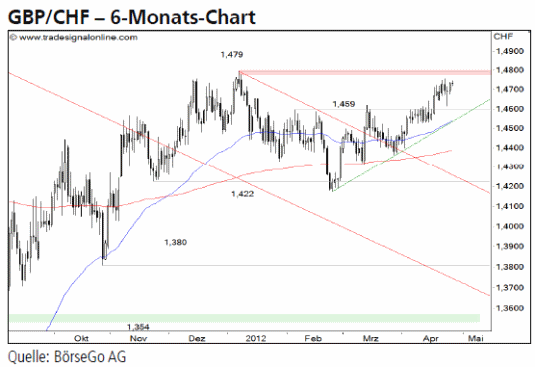 Ausblick: Ein Anstieg über die 1,479 CHF-Marke würde nach unserer Auffassung ein mittel- bis langfristiges Kaufsignal erzeugen. Die marginale preisliche Korrektur des massiven Anstiegs von 2011 legt dies nahe. Die Long-Szenarien: Gelingt den Bullen in GBP/CHF der nachhaltige Ausbruch über 1,479 CHF auf Tagesschlusskursbasis, wäre zunächst mit einer weiteren Kaufwelle bis 1,490 und 1,518 CHF zu rechnen. Auf mittlere Sicht könnte das Paar bereits bis 1,555 CHF haussieren. Entsprechend könnte man einen Ausbruch über 1,479 CHF „long“ handeln. Die Short-Szenarien: Sollte GBP/CHF hingegen am Jahreshoch scheitern, würde dies für eine Fortsetzung der Seitwärtskorrektur sprechen. In der Folge wäre ein Rücksetzer an die Unterstützungen bei 1,459 und 1,440 CHF zu erwarten. Hier könnte jedoch bereits der nächste Kaufimpuls einsetzen. Bearish wäre im aktuellen Umfeld ohnehin erst ein nachhaltiger Bruch der 1,422 CHF-Marke zu werten. Dies könnte Verluste auf 1,380 CHF nach sich ziehen.