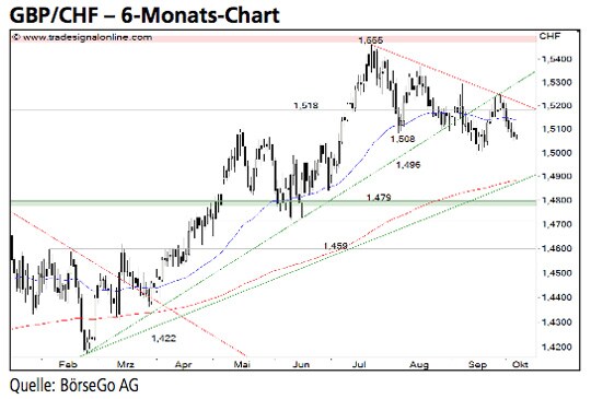 Rückblick: Nach dem dynamischen Ausbruch über den starken Widerstand bei 1,479 CHF stieg das Devisenpaar GBP/CHF bis an die markante Barriere bei 1,555 CHF. Seit Anfang August wird diese Kaufwelle in einer breitangelegten...