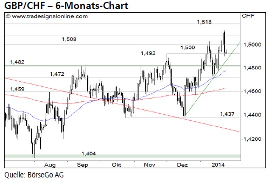Ausblick: Der steile Anstieg der letzten Wochen hat das Devisenpaar GBP/CHF aus dem Seitwärtsmarkt der vergangenen Monate herauskatapultiert. Eine kurze Korrektur dieser Bewegung ist daher nicht ungewöhnlich. Der übergeordnete Aufwärtstrend dürfte sich im Anschluss jedoch fortsetzen. Die Long-Szenarien: Zunächst könnte es jetzt zu einer Fortsetzung der Korrektur bis 1,492 CHF kommen. An der dort verlaufenden Aufwärtstrendlinie dürfte der Wert jedoch wieder nach Norden drehen und die Hürde bei 1,508 CHF erneut ansteuern. Ein Ausbruch über die Marke würde für die Fortsetzung des Aufwärtsimpulses sprechen und einen Anstieg bis 1,518 CHF nach sich ziehen. Gelingt der Käuferseite auch der Bruch dieser Barriere, wäre der Weg bis an das Rallyhoch des Jahres 2012 bei 1,555 CHF frei. Die Short-Szenarien: Setzt GBP/CHF dagegen unter 1,492 CHF zurück, könnte sich diese Gegenbewegung kurzzeitig bis an die Unterstützung bei 1,482 CHF ausdehnen. Der Aufwärtstrend würde dadurch jedoch nicht in Frage gestellt. Vielmehr sollte sich das Währungspaar auf diesem Niveau stabilisieren und im Anschluss erneut in Richtung der 1,508 CHF-Marke haussieren. Sollte die Haltemarke bei 1,482 CHF dagegen durchbrochen werden, wäre ein erstes ernstzunehmendes Verkaufssignal aktiviert. Dies dürfte einen Ausverkauf bis 1,459 CHF nach sich ziehen.