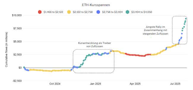 Die jüngste starke ETH-Performance scheint die Zuflüsse zu erklären - starke Kursbewegungen schaffen oft ein optimistischeres Umfeld. Seit dem Start der US-ETH-ETFs im Juli 2024 verlaufen ETH-Kurs und ETF-Zuflüsse nahezu im Gleichschritt.