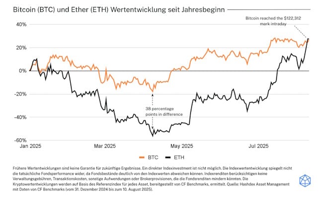 Der Anstieg folgt auf wichtige US-Entwicklungen Ende Juli, darunter die Verabschiedung des GENIUS Act und des Clarity Act sowie ein deutlicher Anstieg der ETF-Zuflüsse.