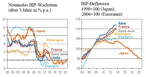 Zurzeit hat der Euroraum einiges mit dem Japan der 1990er Jahre gemeinsam. Wie damals Japan muss der Euroraum eine Reihe grösserer Schocks verkraften. Um den Schock der Finanzkrise abzufedern, liess Europa einen starken Anstieg der Staatsverschuldung zu. Selbst jetzt nach einigen Jahren der Sparpolitik sind die Staatsschulden noch immer hoch. Einige Ähnlichkeiten mit Japan sind recht verblüffend - vor allem im Vergleich mit Spanien, wo das nominale Wachstum von durchschnittlich fast 8% kurz nach der Jahrtausendwende auf -1% seit Anfang der 2010er Jahre gefallen ist und der BIP-Deflator seit 2008 stagniert. Im Euroraum insgesamt bietet sich ein ähnliches, wenn auch weniger ausgeprägtes Bild wie in Japan. In nur wenigen Jahren ist das nominale Wachstum von 4% auf unter 2% gefallen. Der BIP-Deflator hat sich hier zwar anders entwickelt als damals in Japan, aber gefallen ist er zweifellos.