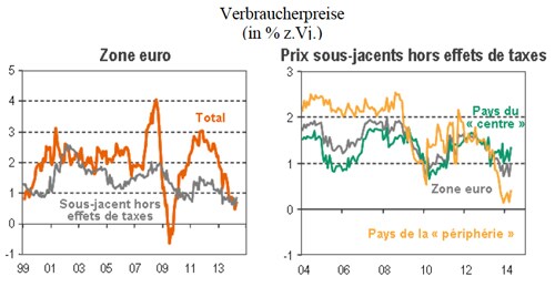 2011 ist der Verbraucherpreisindex für den Euroraum um 3% gestiegen. Seitdem ist die Inflation kontinuierlich zurückgegangen, von über 2% Ende 2012 auf 0,5% im Mai 2014. Richtig ist, dass die fallenden Preise landwirtschaftlicher Rohstoffe massgeblich dazu beigetragen haben, und selbst die um diesen volatilen Faktor sowie um Steuererhöhungen bereinigte Inflation ist gefallen: von 1,5% Ende 2011 auf 1% Ende 2012 und 0,8% im April 2014. Unabhängig davon, wie man die Inflation definiert, ist sie im Euroraum heute sehr niedrig. Es genügt allerdings nicht, den Euroraum als Ganzes zu betrachten. Dafür sind die Unterschiede zwischen den Mitgliedsländern zu gross. In Deutschland liegt die Inflation stabil bei 1%, in Frankreich ist sie hingegen unter 1% gefallen. Und noch wichtiger: In Portugal und Spanien stagnieren die Preise (seit Mitte 2011 bzw. Ende 2012), und in Griechenland fallen sie seit 2011. Der spektakuläre Einbruch der Inflation im Euroraum weckt bei vielen Anlegern allmählich die Angst, dass die Wirtschaft in die Deflation rutscht - ähnlich wie in Japan in den 1990ern.