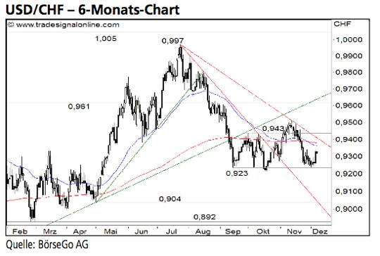 Zwar konnten die Käufer eine steile Abwärtstrendlinie Anfang November überwinden, doch hat der Rücksetzer unter 0,938 CHF diese bullishen Vorgaben zunichte gemacht. Die Short-Szenarien: Setzt das Währungspaar unter 0,923 CHF zurück, wäre ein weiteres Verkaufssignal ausgebildet, welches man entsprechend mit einem Shortengagement handeln könnte. In der Folge dürfte ein Ausverkauf bis 0,910 CHF einsetzen. Dieser könnte sich unterhalb der Marke bis zur Unterstützung bei 0,904 CHF ausweiten. Sollte es an dieser Stelle nicht zu einer Bodenbildung kommen, wären bereits weitere Verluste bis 0,892 CHF zu erwarten. Die Long-Szenarien: Bei einem Anstieg über den Zwischenwiderstand bei 0,938 CHF kann eine kurzfristige Erholung bis 0,943 CHF und dar- über gegebenenfalls bis 0,951 CHF führen. Allerdings würde erst ein nachhaltiger Ausbruch über diesen markanten Wider- stand ein bullishes Signal erzeugen. In diesem Fall wäre die Gefahr eines Bruchs der Unterstützung bei 0,923 CHF vorerst gebannt und eine Kaufwelle bis in den Bereich um 0,961 CHF zu erwarten. Auf diesem Niveau könnte es zu einer Korrektur kommen. Ein anschliessender Ausbruch über 0,961 CHF würde bereits ein Kaufsignal generieren, welches man entsprechend „long“ handeln könnte. In der Folge dürfte das Währungspaar mittelfristig bis 0,977 CHF und darüber bis auf 0,997 CHF ansteigen. Ein Ausbruch über diese Kursbarriere ist zum jetzigen Zeitpunkt jedoch mehr als fraglich.