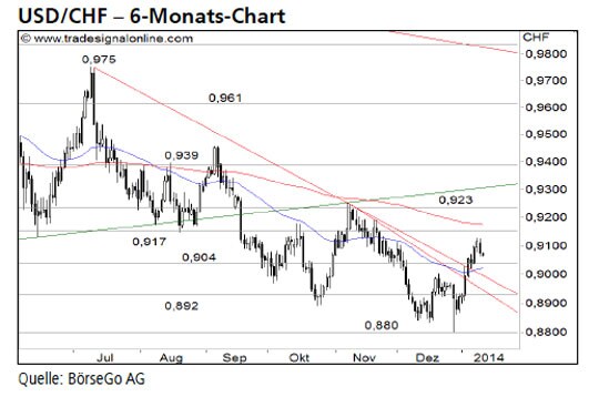 Rückblick: Das Devisenpaar USD/CHF bildete im Juni 2012 mit 0,997 CHF ein neues Verlaufshoch aus und befindet sich seit diesem Zeitpunkt in einer übergeordneten Korrektur des vorherigen steilen Anstiegs.