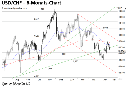 Bislang deutet sich kein Ende des übergeordneten Abwärtstrends bei USD/CHF an. Vielmehr ist die Wahrscheinlichkeit erhöht, dass die Erholung seit Anfang April in dieser Woche zuende gegangen ist. Die Short-Szenarien: Bricht das Paar jetzt auch unter die markante Unterstützung bei 0,961 CHF ein, wäre ein kleines Verkaufssignal gebildet und in dessen Folge mit einem Kursrutsch bis an die 0,950 CHF-Marke zu rechnen. Dort hätten die Bullen ein weiteres Mal die Chance eine kurzfristige Erholung zu starten. Setzen sich dagegen die Bären durch und durchbrechen die Marke, wäre ein Ausverkauf bis 0,939 CHF zu erwarten. Unterhalb dieser Haltemarke könnte es anschliessend zu einem erneuten Kurseinbruch bis an die 0,923 CHF-Marke kommen. Die Long-Szenarien: Sollten die Käufer dagegen die 0,968 CHF-Marke und die Aufwärtstrendlinie auf Höhe von 0,972 CHF zurückerobern können, würde sich die Erholung zunächst bis 0,980 CHF fortsetzen. Dort wäre eine Wiederaufnahme der Baisse wahrscheinlich. Ein Anstieg über die Hürde könnte jedoch zu einer leichten Aufwärtsbewegung bis 0,983 CHF führen. Allerdings ist erst bei einem Ausbruch über diesen Widerstand mit einer stärkeren Kaufwelle zu rechnen, die Potenzial bis 1,000 CHF hätte.