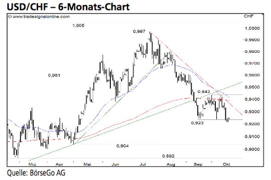 Kurzfristig könnte sich der Kursrückgang bei USD/CHF nach unserer Auffassung weiter fortsetzen. Ein Rücklauf an die Tiefs vom Frühjahr ist weiter wahrscheinlich. Die Short-Szenarien: Sollte USD/CHF unterhalb von 0,928 CHF verbleiben, dürfte es zu einer weiteren Verkaufswelle bis 0,910 CHF und 0,904 CHF kommen. Darunter dürfte die 0,892 CHF-Marke angesteuert werden, ehe es zu einer Bodenbildung kommen könnte. Sollte auch diese Unterstützung unterschritten werden, wären mittelfristige Verluste bis 0,856 CHF möglich. Die Long-Szenarien: Kann die Unterstützung bei 0,928 CHF dagegen zurückerobert werden, dürfte eine kurzzeitige Erholung bis 0,943 CHF führen. Doch erst der nachhaltige Ausbruch über diese starke Kursbarriere würde für eine deutliche Gegenbewegung sprechen. In diesem Fall könnte das Währungspaar entlang der Unterseite der im September gebrochenen Aufwärtstrendlinie ansteigen. Auf mittlere Sicht wäre der Widerstand bei 0,961 CHF erreichbar. Allerdings dürfte auf diesem Niveau bereits eine weitere Gegenbewegung einsetzen und den Wert an den Ausbruchspunkt zurückführen.