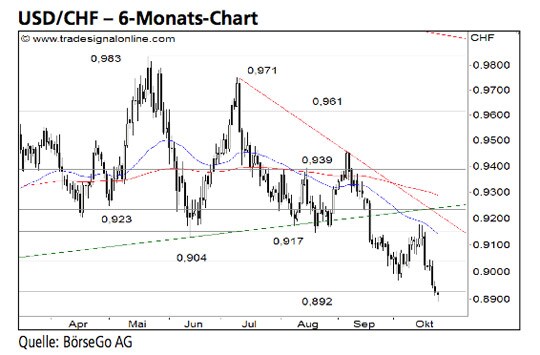 Der Ausverkauf der letzten Tage hat zu einer Beschleunigung der Abwärtsdynamik des Devisenpaares geführt. Das Verkaufssignal des gestrigen Handels dürfte den Wert weiter unter Druck setzen. Die Short-Szenarien: Verbleibt USD/CHF unterhalb des Zwischentiefs bei 0,896 CHF, dürfte sich die Baisse des Wertes zunächst bis 0,880 CHF fortsetzen. An dieser Stelle könnte es zu einer leichten Erholung kommen. Wird diese Marke jedoch im Anschluss ebenfalls unter- schritten, wäre das langfristige Verkaufssignal bestätigt und mit weiteren Abgaben bis 0,865 CHF zu rechnen. Auf mittlere Sicht könnte in diesem Fall sogar ein Kurseinbruch bis 0,855 CHF nicht mehr ausgeschlossen werden. Die Long-Szenarien: Zu einer leichten Gegenbewegung käme es dagegen, sollte USD/CHF umgehend wieder über 0,896 CHF ansteigen. Sollte in der Folge auch der Widerstand bei 0,904 CHF durchbrochen werden, dürfte sich die Erholungsphase kurzfristig bis 0,923 CHF ausdehnen. Auf diesem Kursniveau wäre jedoch davon auszugehen, dass aufkommender Verkaufsdruck zu einem weiteren mehrtägigen Verkaufsimpuls führt. Erst der nachhaltige Ausbruch über diesen Kreuzwiderstand wäre als ers- tes Indiz für ein vorübergehendes Ende der Baisse zu werten. Nach einem erfolgreichen Anstieg über diese Marke könnte das Währungspaar die Gegenbewegung zunächst bis 0,939 USD fortsetzen.