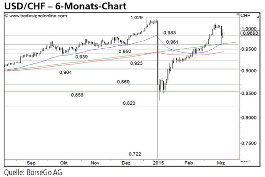 Rückblick: Nachdem das Währungspaar USD/CHF Anfang Januar ein neues Verlaufshoch bei 1,029 CHF erreicht hatte, kam es im Zuge des SNB-Entscheids zur Untergrenze des Schweizer Franken zum Euro zu einem massiven Einbruch.