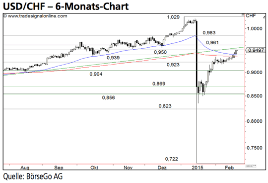 Rückblick: Das Währungspaar USD/CHF befand sich bis Mitte Januar in einem soliden und langfristigen Aufwärtstrend, ehe die Aufhebung des Mindestkurses des Schweizer Franken zum Euro durch die Schweizer Nationalbank einen gewaltigen Kurseinbruch verursachte.