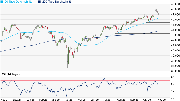 wieder angesteuert werden. Mit dem Zwischentief vom 14. Oktober bei 45.452 Punkten würde sich noch eine weitere massive Unterstützung in den Weg stellen, ehe ein Rücksetzer auf das jüngste Ausbruchsniveau bei 45.017/45.074 Punkten drohen konnte. Kann sich der Dow hingegen oberhalb von 47.050 Punkten behaupten, wäre auf der Oberseite zumindest wieder Platz bis zum jüngsten Rekordhoch.