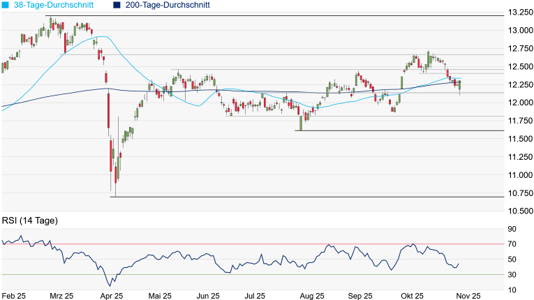 seinem Tageshöchst bei 12.307 Punkten in den Feierabend, konnte sich also um mehr als 206 Punkte von seinem Tagestief lösen. Aus charttechnischer Sicht wichtig könnte die Rückeroberung der aktuell bei 12.289 Punkten verlaufenden 200-Tage-Linie gewesen sein. Voraussetzung, der vielbeachtete Durchschnitt wird heute verteidigt. Eine Erholung wird jedoch durch den aktuell bei 12.337 Punkten verlaufenden 38-Tage-Durchschnitt erschwert. Etwas gravierender aufhellen würde sich das kurzfristige