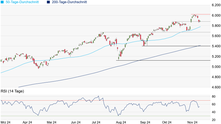 die NVIDIA-Zahlen respektive der Ausblick enttäuschend ausfallen, könnte das Oktober-Hoch und das Tief vom Freitag bei 5.853 Punkten noch einmal angesteuert werden. Geht es darunter, könnte der aktuell bei 5.780 Punkten verlaufende 50-Tage-Durchschnitt wieder ein Thema werden.