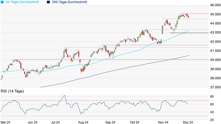 Rückschlagpotenzial wäre dann zunächst jedoch begrenzt, denn mit dem Oktober-Hoch bei 43.325 Punkten, dem 50-Tage-Durchschnitt bei aktuell 43.205 Punkten und dem jüngsten Zwischentief bei 42.939 Punkten würde der Dow auf drei massive Unterstützungen treffen.