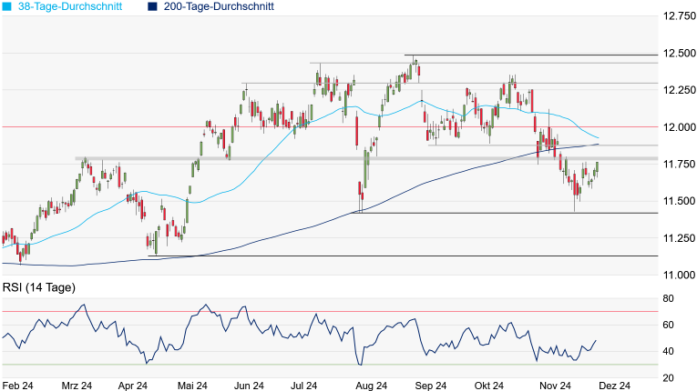 Punkten verlaufenden 38-Tage-Linie allerdings noch drei Hindernisse aus dem Weg geräumt werden, ehe die psychologisch relevante 12.000-Punkte-Marke wieder in den Fokus rücken könnte. Erfüllen sich die Hoffnungen auf eine Jahresendrally hingegen nicht, könnte das August-Tief bei 11.417 Punkten möglicherweise noch einmal ein Thema werden.