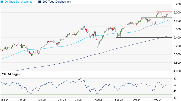 Quelle: Bloomberg. Bitte beachten Sie, dass aus der Wertentwicklung in der Vergangenheit nicht auf die zukünftige Wertentwicklung geschlossen werden kann. | | Charttechnik: Mal laufen die Tech-Werte besser, mal die Standardwerte. Gut, dass im marktbreiten S&P 500 zahlreiche Werte beider Gattungen enthalten sind, denn mit einem Zuwachs von 25,53 Prozent seit Jahresanfang hat sich der S&P 500 bisher besser entwickelt als beispielsweise der US-Leitindex Dow Jones oder der technologielastige NASDAQ-100. Gestern ging es für den S&P 500 kurzzeitig über das Hoch von 11. November bei 6.017 Punkten - bei 6.020,75 Punkten setzte der marktbreite Index daraufhin eine neue