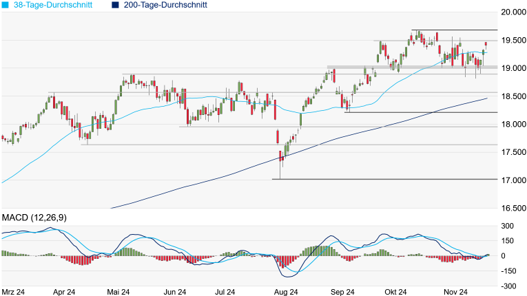 verlaufende 38-Tage-Linie heute noch einmal in den Fokus. Bei einem Unterschreiten könnte sogar auch die Unterstützungszone zwischen 19.045 und 18.991 Punkten wieder ein Thema werden. Etwas gravierender eintrüben würde sich das Chartbild jedoch erst bei einem Unterschreiten des Mai-Tiefs bei 18.893 Punkten.