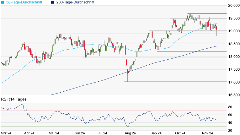 Feierabend retten. Das kurzfristige Chartbild hat sich somit nicht weiter eingetrübt. Aktuell zeichnet sich eine leichte Erholung zur Wochenmitte ab. Kann der DAX die aktuell bei 19.289 Punkten verlaufende 38-Tage-Linie überqueren, würde sich sogar weiteres Erholungspotenzial bis zum September-Hoch bei 19.492 Punkten eröffnen.