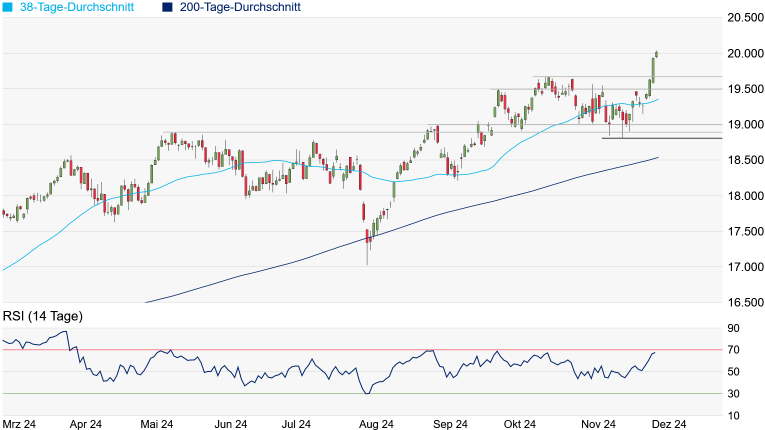 Gewinnmitnahmen blieben aus. Bleiben jedoch auch die Anschlusskäufe aus, könnte es auch schnell wieder unter die runde Marke gehen. Das alte Hoch bei 19.675 Punkten könnte dann durchaus noch einmal angesteuert werden. Mit dem September-Hoch bei 19.492 Punkten würde noch eine weitere solide Unterstützung warten.