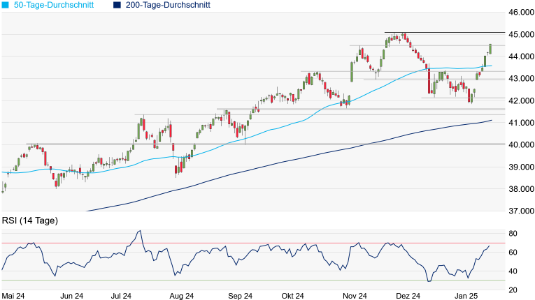 könnte der aktuell bei 43.585 Punkten verlaufende 50-Tage-Durchschnitt noch einmal angesteuert werden. Mit dem Oktober-Hoch bei 43.325 Punkten würde knapp darunter eine weitere solide Unterstützung warten.