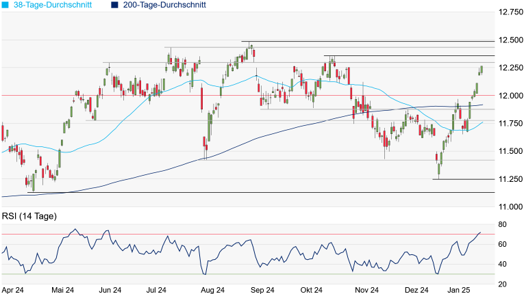 jedoch noch drei Hindernisse in den Weg. Kann das August-Hoch überquert werden, könnte sogar das Rekordhoch aus dem Jahr 2022 bei 12.997 Punkten wieder ein Thema werden. Allerdings liegt bereits eine deutlich überkaufte Marktphase vor. Kommt es zu Gewinnmitnahmen, taucht die erste Unterstützung erst an der psychologisch wichtigen 12.000-Punkte-Marke auf. Die erste signifikante Unterstützung wartet sogar erst am aktuell bei 11.918 Punkten verlaufenden 200-Tage-Durchschnitt.