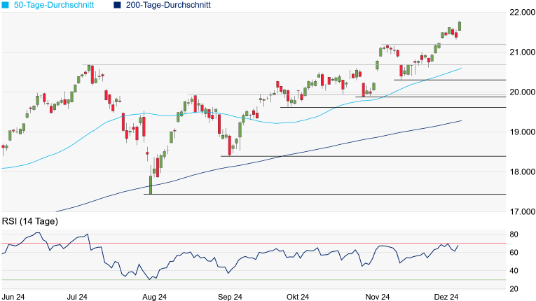 erst bei 21.785 Punkten nach, wo nun die neue historische Bestmarke liegt. Wohin die Reise noch gehen kann, ist ungewiss, jedoch ging der NASDAQ-100 unweit seiner neuen Bestmarke aus dem Handel, womit das Chartbild weiterhin Kaufargumente liefert. Kommt es nun jedoch vereinzelt zu Gewinnmitnahmen, könnte das Tief vom Dienstag bei 21.313 Punkten bereits Halt bieten. Geht es darunter, dürfte das November-Hoch bei 21.182 Punkten noch einmal angesteuert werden, ehe das Juli-Hoch bei 20.691 Punkten