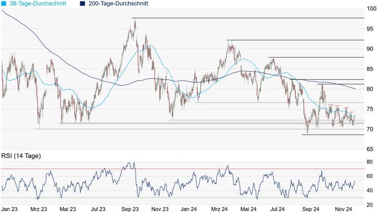 ist zu viel Optimismus noch nicht angebracht, denn die jüngsten Hochpunkte weisen eine fallende Tendenz auf. Gravierend aufhellen würde sich das Chartbild somit erst oberhalb des Zwischenhochs vom 24. Oktober bei 76,08 Dollar. Mit dem Widerstandsbereich bei 76,41/76,66 Dollar würde sich recht zeitnah ein weiteres Hindernis in den Weg stellen, ehe sich etwas mehr Spielraum nach oben eröffnen würde. Entwarnung kann aber immer noch nicht gegeben werden. Bei einem Unterschreiten des