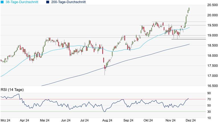 Die Rally am deutschen Aktienmarkt setzte sich gestern eindrucksvoll fort - der Leitindex DAX rückte um weitere 127 Punkte oder 0,63 Prozent auf einen neuen Schlussrekord bei 20.359 Punkten vor. Im Tageshoch packte der DAX sogar noch gut 14 Punkte drauf und setzte bei 20.373 Punkten eine neue historische Bestmarke. Es war bereits der sechste Anstieg in Folge. In dieser Zeit rückte der DAX in Summe um 1.097 Punkte oder 5,7 Prozent vor. Marktbeobachtern zufolge will niemand der Erste sein, der