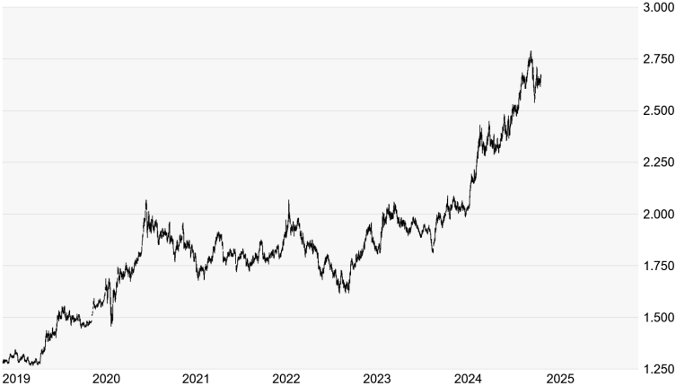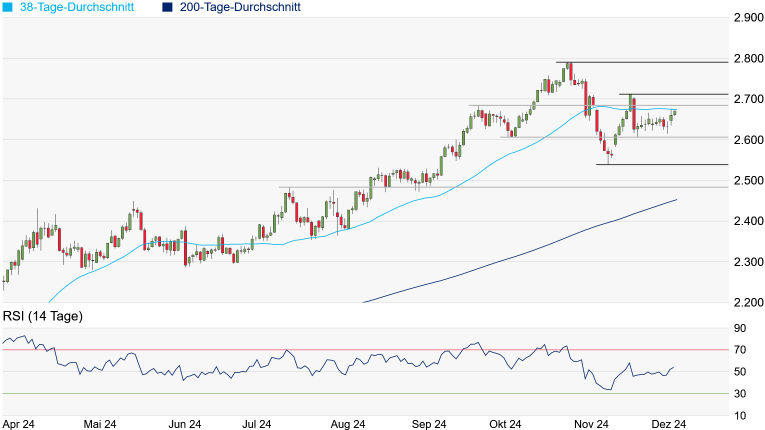 2.790 Dollar allerdings nur noch das Zwischenhoch vom 22. November bei 2.712 Dollar in den Weg stellen. Während der jüngsten Konsolidierung konnte sich der Goldpreis stets oberhalb des Oktober-Tiefs bei 2.606 Dollar behaupten. Das Chartbild würde sich daher erst bei einem Unterschreiten wieder etwas gravierender eintrüben. Ein neues Verkaufssignal würde allerdings erst unterhalb des November-Tiefs bei 2.538 Dollar generiert.