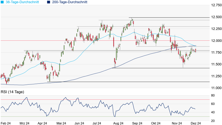 November fand der SMI bei 11.429 Punkten Halt. Der Zug auf der Oberseite muss aber noch nicht abgefahren sein, auch wenn die SMI-Indikationen in der Früh erneut leicht im Minus notieren. Findet der SMI in diesem Jahr doch noch zurück in die Spur, würden sich auf der Oberseite nach dem Überqueren der Zone noch der aktuell bei 11.866 Punkten verlaufenden 38-Tage-Durchschnitt, das September-Tief bei 11.878 Punkten und die aktuell bei 11.896 Punkten verlaufende 200-Tage-Linie in den Weg stellen,
