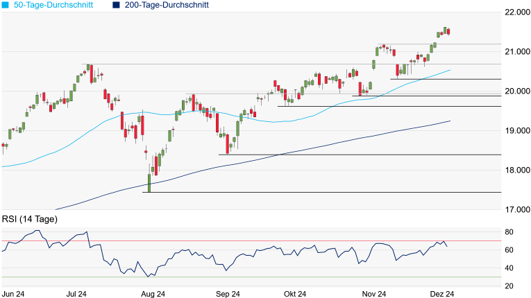 Kann der NASDAQ-100 das Hoch vom Freitag bei 21.626 Punkten herausnehmen, könnte die nächste 1.000er-Marke in den Fokus rücken. Kommt es hingegen zu ausgeprägteren Gewinnmitnahmen, würde die erste signifikante Unterstützung erst am November-Hoch bei 21.182 Punkten auftauchen. Weitere Unterstützungen würden am Juli-Hoch bei 20.691 Punkten und am aktuell bei 20.539 Punkten verlaufenden 50-Tage-Durchschnitt warten.