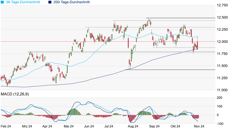 vielbeachteten 200er-Durchschnitts behaupten, womit sich das Chartbild zwar weiter eintrübte, aber noch nicht gravierend. Nun kommt es auf die heutige Reaktion an. Findet der SMI zurück in die Spur, könnte zumindest die psychologisch bedeutende 12.000-Punkte-Marke wieder angesteuert werden, ehe auch der gestern kurzzeitig überquerte 38-Tage-Durchschnitt erneut ein Thema werden könnte. Geht es hingegen weiter abwärts, möglicherweise sogar unter den Unterstützungsbereich bei 11.800/11.772