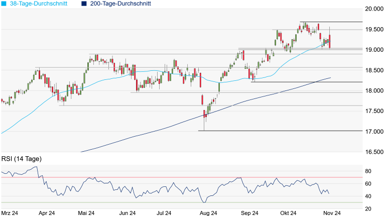 somit wieder in die Unterstützungszone zwischen 19.045 und 18.991 Punkten eingetaucht. Geht es weiter abwärts, droht Ungemach, denn bis zum April-Hoch bei 18.567 Punkten würde sich bei einem Unterschreiten der Unterstützungszone nur noch das Mai-Hoch bei 18.893 Punkten in den Weg stellen. Findet der DAX hingegen zurück in die Spur, könnte die aktuell bei 19.210 Punkten verlaufende 38-Tage-Linie wieder angesteuert werden, ehe das September-Hoch bei 19.492 Punkten erneut in den Fokus rücken