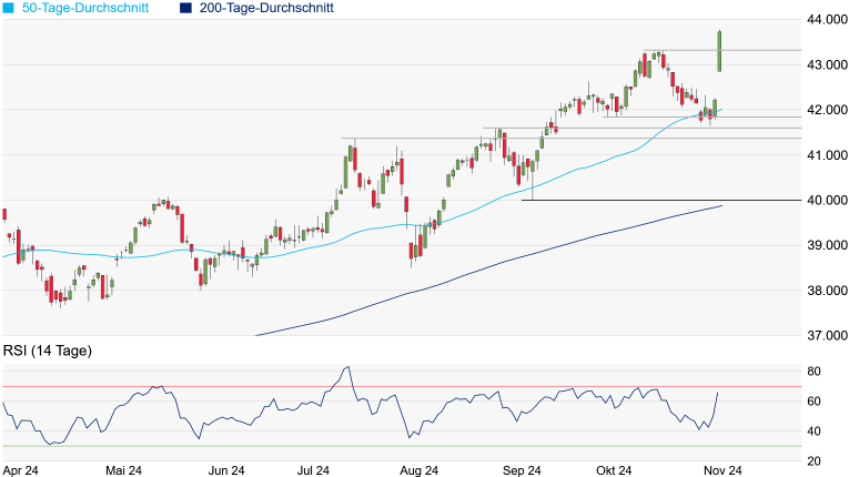 eine weiter freundliche Tendenz andeutet. Allerdings steht mit der Zinsentscheidung der US-Notenbank heute Abend ein weiteres wichtiges Event an. Nimmt US-Notenbank-Chef Jerome Powell Stellung zum Wahlausgang und bremst möglicherweise die Zinserwartungen, könnte die Stimmung auch schnell kippen. Sollte der Dow wieder unter das Oktober-Hoch fallen, würde die erste signifikante Unterstützung erst am aktuell bei 42.019 Punkten verlaufenden 50-Tage-Durchschnitt auftauchen.