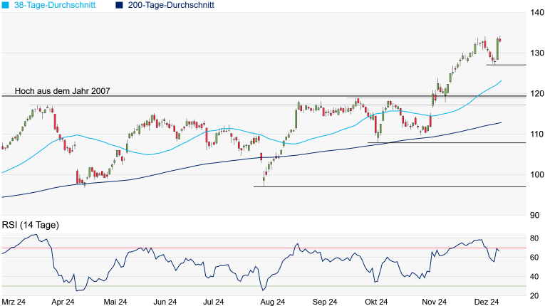 wenn auch nur knapp - im Hoch ging es bei 134,30 Franken auf ein neues 22-Jahres-Hoch aufwärts. Das nächste Hindernis taucht nun am Zwischenhoch vom August 2002 bei 137,00 Franken auf, doch dürfte übergeordnet sogar Platz bis zum Hoch vom Mai 2002 bei 171,25 Franken sein. Das Allzeithoch aus dem Jahr 1998 bei 204,15 Franken erscheint zunächst doch noch ziemlich weit entfernt zu sein. Kommt es erneut zu Gewinnmitnahmen, könnte das jüngste Verlaufstief bei 127,10 Franken noch einmal in