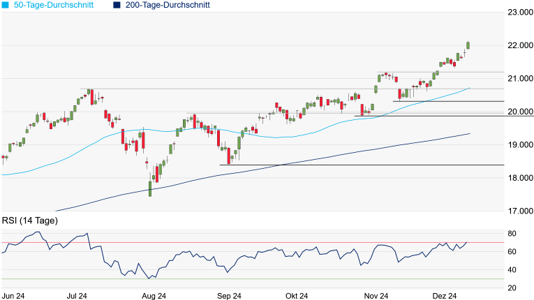 Gewinnmitnahmen auslösen, zumal bereits eine überkaufte Marktphase vorliegt. Die erste signifikante Unterstützung wartet allerdings erst am Hoch vom 11. November bei 21.182 Punkten. Stellen die US-Währungshüter hingegen weitere Zinssenkungen in Aussicht, dürfte die Rally ihre Fortsetzung finden.