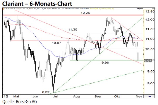 Die Aktien von Clariant sind nach dem gestrigen Kurseinbruch stark angeschlagen und drohen bei einem Rückfall unter 9,96 CHF bis an das Jahrestief zurückzusetzen. Die Short-Szenarien: Sollte es den Bullen nicht gelingen den gestrigen Abwärtsgap umgehend wieder zu schliessen, dürfte es bei einem Rückfall unter 9,96 CHF zu einem weiteren Verkaufs- signal kommen. Dieses könnte man entsprechend mit einem Shortengagement handeln. Kurzfristig dürfte der Wert bis zur Kreuzunterstützung bei 9,65 CHF einbrechen. Würde auch diese Marke unterschritten, sind weitere Verluste bis 9,10 CHF und letztenendes bis 8,62 CHF zu erwarten. Erst auf diesem niedrigen Niveau könnte es zu einer mittelfristigen Bodenbildung kommen. Würde dagegen auch diese Unterstützung gebrochen, läge das nächste Abwärtsziel bereits bei 8,00 CHF. Die Long-Szenarien: Können die Bullen dagegen die 9,96 CHF-Marke verteidigen, wäre zunächst mit einer Erholung bis 10,30 CHF zu rechnen, die sich oberhalb dieser leichten Hürde bis zum markanten Widerstand bei 10,53 CHF ausweiten dürfte. Hier sollte der Wert bereits den Abwärtstrend der letzten Tage wieder aufnehmen. Ein Ausbruch über 10,53 CHF könnte eine leichte Erholung bis 10,87 CHF nach sich ziehen.