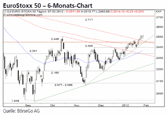 Ausblick: Mit dem Anstieg über 2.448 Punkte haben die Käufer das Ringen um die kurzfristige Zukunft des Index für sich entschieden und weiteres Aufwärtspotential erzeugt. Die Long-Szenarien: Kann der EuroStoxx 50 oberhalb der kleinen Unterstützung bei 2.475 Punkten verbleiben, ist mit einem direkten Ausbruch über 2.506 bis 2.520 Punkte zu rechnen. Darüber stünde einer weiteren Kaufwelle bis 2.565 Punkte aus unserer Sicht nichts mehr im Wege. Selbst ein ungebremster Anstieg bis an die 2.600 Punkte-Marke wäre in diesem Fall möglich. Auf diesem Niveau könnten erste Gewinnmitnahmen angedacht werden. Die Short-Szenarien: Eine Korrektur unter 2.475 Punkte würde nach unserer Auffassung lediglich zu einem zweiten Test des Ausbruchslevels bei 2.448 Punkten führen. Von dort sollte sich der Aufwärtstrend entsprechend weiter fortsetzen. Sollte der Index jedoch unter diese Marke zurücksetzen, sind stärkere Abgaben bis 2.400 Punkte zu erwarten. Allerdings würde erst ein signifikanter Bruch dieser Haltemarke das bullishe Chartbild eintrüben und zu Verlusten bis 2.341 und darunter 2.310 Punkten führen können.