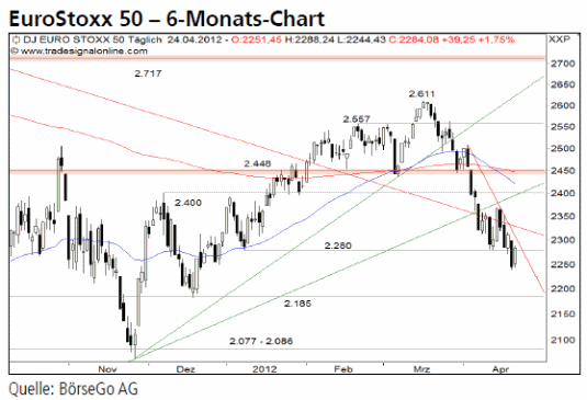 Rückblick: Der EuroStoxx 50 Index beendete den im September2011 eingeschlagenen Aufwärtstrend ...