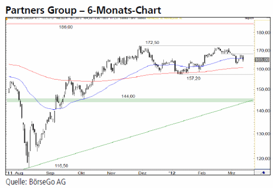 Ausblick: Die Konsolidierung auf hohem Kursniveau und der fehlende Abgabedruck sprechen nach unserer Auffassung klar für die Käuferseite und somit eine zeitnahe Fortsetzung des Aufwärtstrends. Die Long-Szenarien: Können die Aktien der Partners Group über den Widerstand bei 167,90 CHF ausbrechen, könnte dieses kleine Kaufsignal einen Anstieg bis 172,50 CHF auslösen. Wird diese wichtige Barriere ebenfalls überwunden, kann sich der Aufwärtstrend bis 186,00 CHF fortsetzen. Entsprechend könnte man einen Anstieg über 172,50 CHF „long“ handeln. Gelänge selbst der Ausbruch über das Mehrjahreshoch bei 186,00 CHF, wären Kurse um 200,00 CHF erreichbar. Die Short-Szenarien: Für eine Fortsetzung der Konsolidierung würde derzeit erst ein nachhaltiger Bruch der Unterstützung bei 162,50 CHF sprechen. In diesem Fall würde die Haltemarke bei 157,20 CHF angesteuert. Doch erst deren Bruch würde den Aufwärtstrend des Wertes kurzzeitig stoppen und Verluste bis 144,00 CHF wahrscheinlich werden lassen.