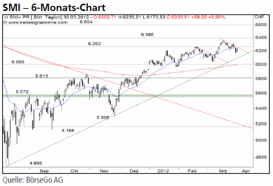 Ausblick: Der erfreuliche Umschwung vom letzten Freitag lässt unserer Einschätzung nach einen positiven Wochenverlauf erwarten. Die angedeutete Dominanz der Bullen könnte sich daher bei einer Rückkehr über 6.262 Punkte weiter entfalten. Die Long-Szenarien: Überwindet der SMI die kurzfristige Abwärtstrendlinie und den Widerstand bei 6.262 Punkten, sollten weitere Zugewinne bis zum noch ausstehenden Rallyziel bei 6.396 Punkten möglich werden. Oberhalb von 6.396 Punkten wären im weiteren Verlauf Notierungen bis 6.604 Punkte zu erwarten. Die Short-Szenarien: Bleibt der Index hingegen unterhalb von 6.262 Punkten und markiert bei wieder aufkommender Schwäche ein neues Tief unterhalb von 6.165 Punkten, ist ein Test der primären Aufwärtstrendlinie möglich. Ein Bruch derselben und Notierungen unterhalb von 6.100 Punkten sollten zu einer Korrekturausdehnung bis zur Marke von 6.000 Punkten führen. Darunter müssten nochmals etwa 200 Punkte an Reaktionspotenzial bis zum Unterstützungsniveau bei 5.813 Punkten einkalkuliert werden.