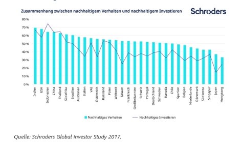 Dazu Jessica Ground, Leiterin Sustainability bei Schroders: "Die Studie kommt zu einer Reihe wichtiger Erkenntnisse hinsichtlich der Einstellungen und Handlungen in Bezug auf ein sozial verantwortungsvolleres und nachhaltigeres Leben. Sie bestätigt, was wir bereits vermutet haben: In Ländern, in denen sich die allgemeine Einstellung bereits in Richtung einer nachhaltigeren Lebensweise bewegt, zeigt sich diese Tendenz nun auch in der Auswahl nachhaltiger Anlagen.