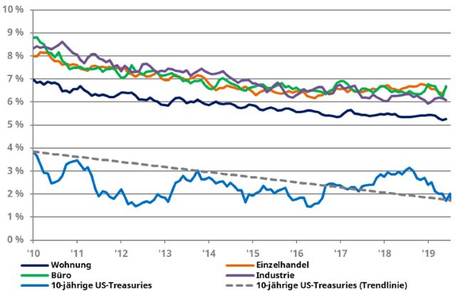 Renditen zehnjähriger US-Treasuries & Nettoanfangsrenditen nach Immobilienarten
