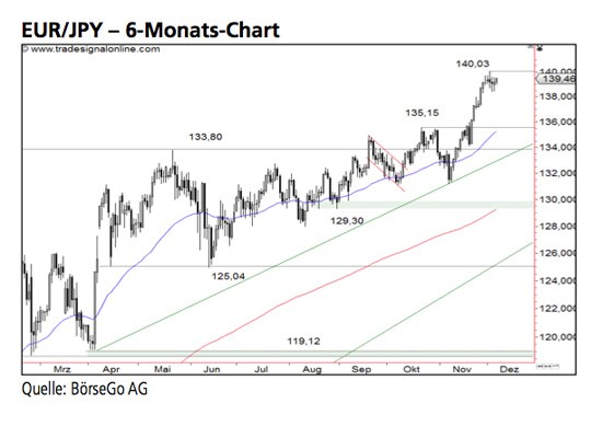 Jetzt informierenAusblick: Mit dem Ausbruch über die 133,80 JPY-Marke haben die Bullen ein mittelfristiges Kaufsignal generiert. Die aktuelle Gegenbewegung dürfte einen neuerlichen Anstieg vorbereiten. Die Long-Szenarien: Zunächst dürfte das Paar kurzfristig bis an die Zwischenunterstützung bei 107,00 JPY zurücksetzen, dort jedoch von den Bullen aufgefangen werden und sich eine erneute Kaufwelle anschliessen. Bei einem Ausbruch über das Rallyhoch bei 140,03 JPY dürfte ein direk- ter Anstieg bis an die Hürde bei 143,00 JPY folgen. Sollte im weiteren Verlauf auch diese Barriere durchbrochen werden, könnte das Devisenpaar auf Sicht der kommenden Monate sogar bis 147,50 und 150,72 JPY haussieren. Die Short-Szenarien: Dagegen hätte ein Ausverkauf unter die Haltemarke bei 137,00 JPY eine Ausweitung der Korrektur bis an die so- lide Unterstützung bei 135,15 JPY zur Folge. An dieser Stelle könnten sich die Käufer wieder formieren und einen weiteren Aufwärtsimpuls auslösen, der den Wert an das aktuelle Rally- hoch zurückführen dürfte. Sollte EUR/JPY dagegen auch unter diese Marke zurücksetzen, müsste die Kreuzunterstützung bei 133,80 JPY verteidigt werden, um ein erstes deutliches Ver- kaufssignal zu vermeiden. Sollte dies nicht gelingen, wäre zu- dem die mittelfristige Aufwärtstrendlinie unterschritten. In diesem Fall dürfte das Währungspaar bis 129,30 JPY einbrechen.