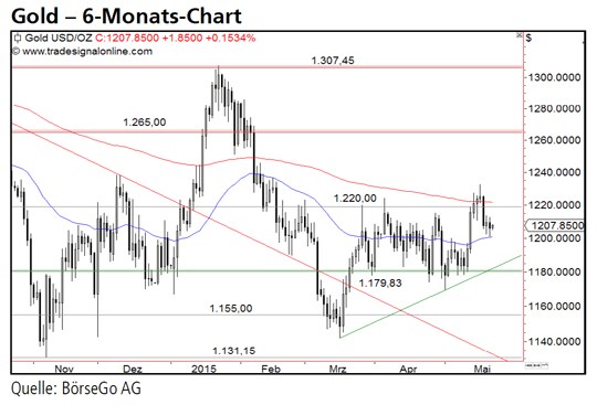 Jetzt informierenAusblick: Kurzfristig ist der Goldpreis unter Druck. Die Chancen auf eine Fortsetzung der Kaufwelle von Anfang Mai bleiben jedoch weiter bestehen. Die Long-Szenarien: Setzt der Goldpreis die kurzfristige Abwärtsbewegung mit einem Bruch der 1.200,00 USD-Marke fort, dürfte die nächste Aufwärtsbewegung erst nach dem Erreichen der Unterstützung bei 1.179,83 USD einsetzen. Wird die Marke dagegen verteidigt, dürfte die Hürde bei 1.220,00 USD direkt überschritten werden und der Goldpreis weiter in Richtung des Widerstands bei 1.265,00 USD klettern. Ein Ausbruch über diese Marke hätte ein weitreichendes Kaufsignal und eine Ausweitung der Kaufwelle bis 1.307,45 USD zur Folge. Die Short-Szenarien: Bei einem Bruch der Haltemarke bei 1.179,83 USD wäre der seit Mitte März etablierte Aufwärtstrend dagegen beendet. In diesem Fall hätten die Bären das Ringen um den mittelfristige Kursverlauf des Edelmetalls für sich entschieden. In der Folge dürften Abgaben bis an die Unterstützung bei 1.155,00 USD und darunter bereits bis an das markante Tief bei 1.131,15 USD belasten.